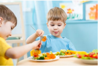 Le temps du repas est un temps d’éducation dans la méthode Montessori. Les enfants apprennent à mettre la table, à la débarrasser. Le temps de repas est encadré par l’éducatrice et l’assistant.